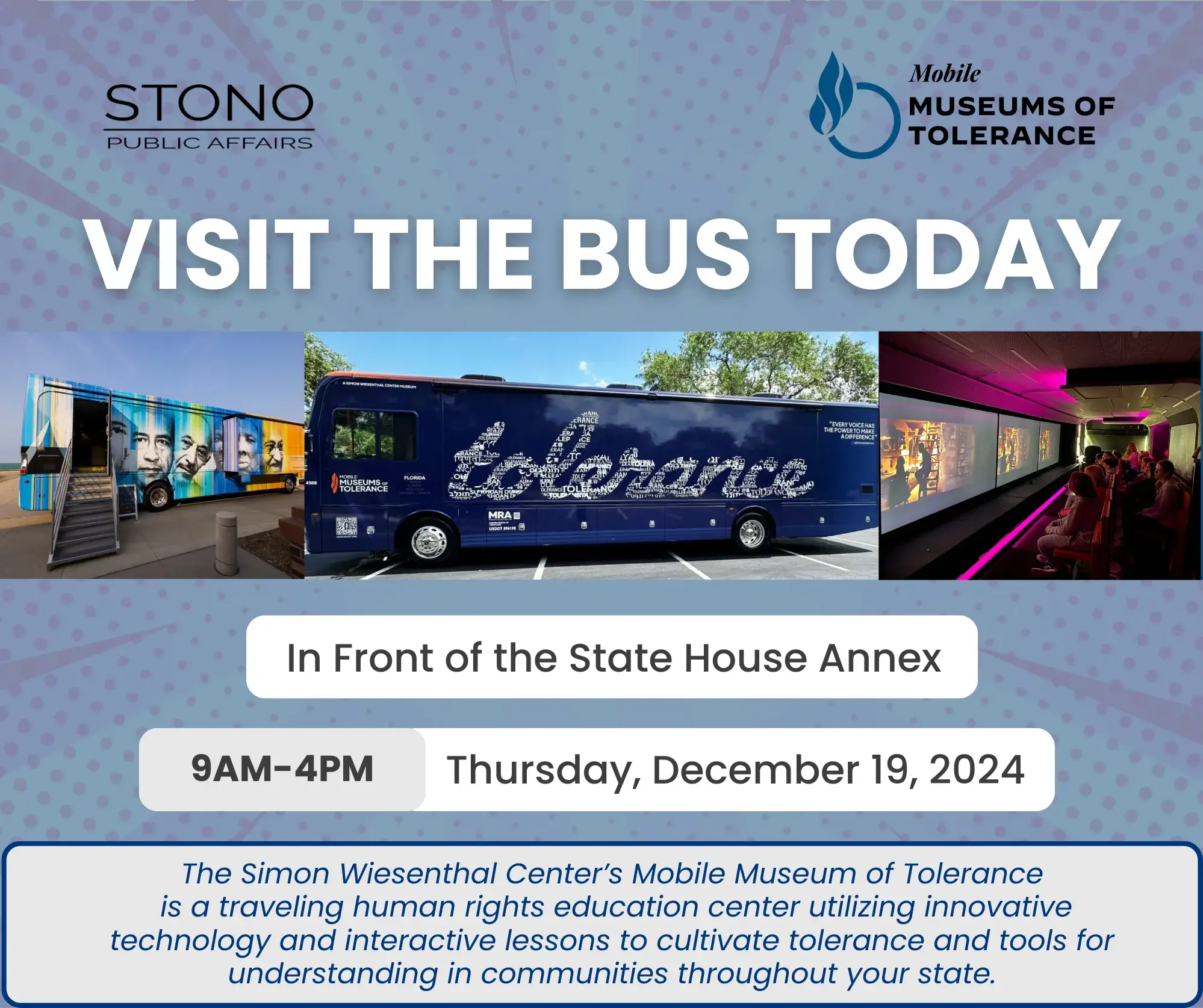 The Simon Wiesenthal Center‘s Mobile Museum of Tolerance is a traveling human rights education center utilizing innovative, technology and interactive lessons to cultivate tolerance and tools for understanding in communities throughout your state.
